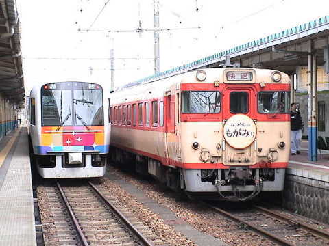 陸羽西線古口駅に停車中。 下り列車と交換待ち。 通常と違い右側通行での交換。 |
