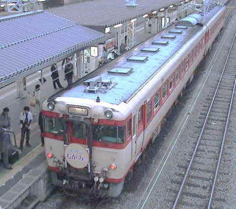 酒田駅に着くと駅構内に留置されていました 「なつかしのもがみ号」です。 盛モリ所属の復活急行色車。 大型のヘッドマークが付いています。 |
