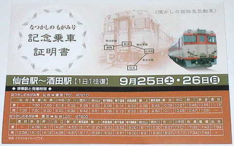 酒田発車後すぐに頂いた 記念乗車証明書。 詳細な到着時間が解り重宝しました。 |