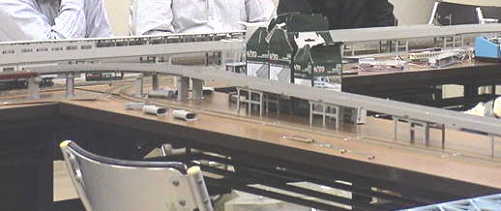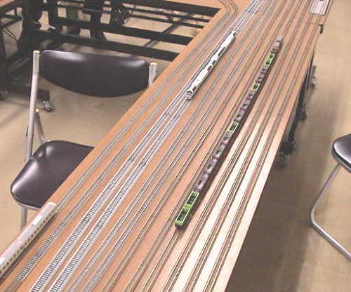 奥の線路です。 KATOの高架線以外の12線が 机の幅一杯に敷設されました。 |